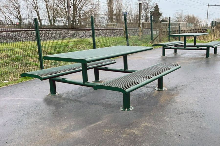 Bænken er udelukkende lavet af stål, hvilket har den fordel at sædet let tørrer op efter regnvejr. Stålet er varmgalvaniseret og forsynet med en to-lags pulverlakering. Dette sikrer, at stålet er beskyttet mod forskellige vejrforhold og dermed kan holde i årevis på udendørsområdet. Stålet kan belægges i enhver RAL eller AKZO farve.