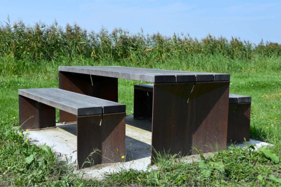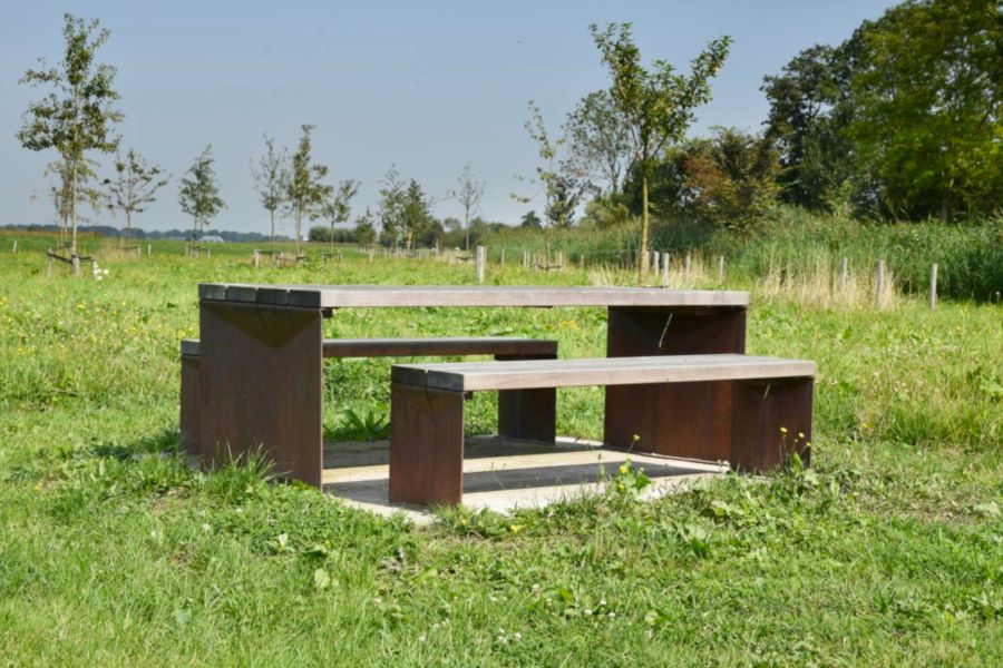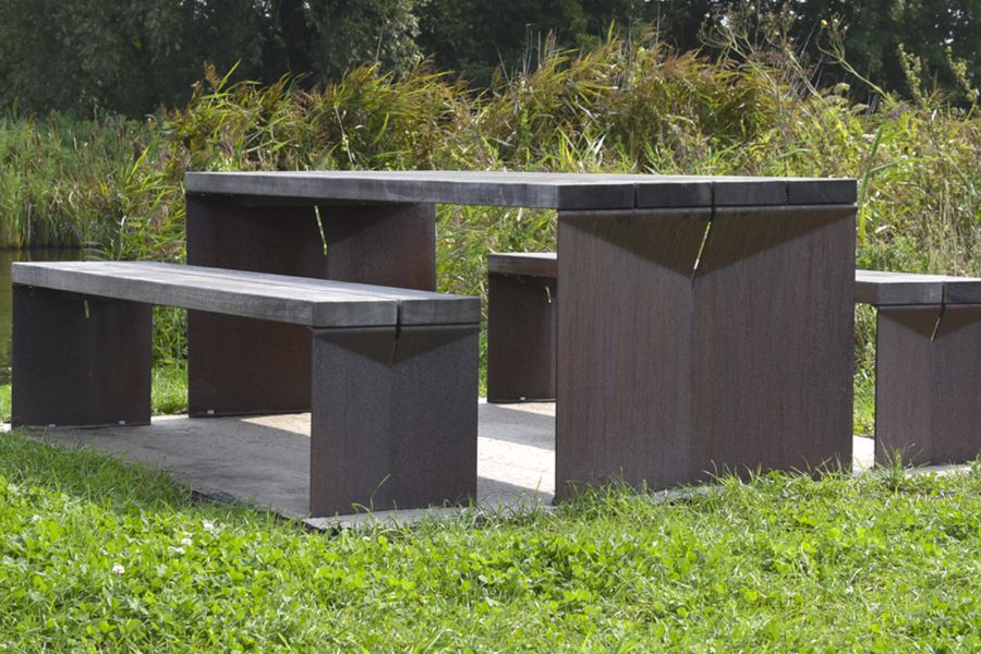 Ben er lavet af sandblæst cortenstål. Cortenstålet giver bænken et mere naturligt udseende. bord- bænkesættet kan også laves af varmgalvaniseret og pulverlakeret stål. Stålet kan lakeres i alle tilgængelige RAL-farver.